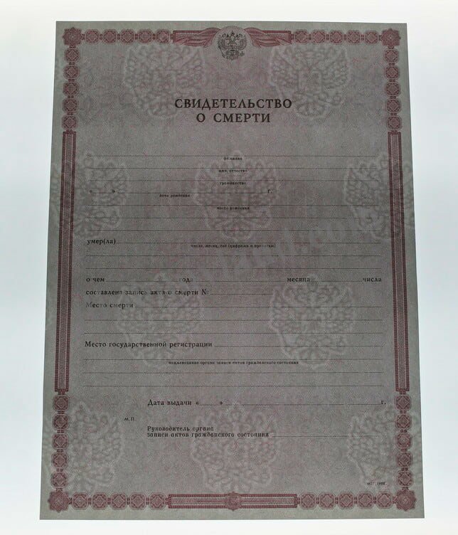 Чтобы купить свидетельство о смерти, сообщите личные данные усопшего консультантам нашей компании. После уточнения подробностей менеджеры начнут работать над изготовлением, и в течение короткого периода времени на руках у заказчика окажется требуемый документ на специальном бланке.